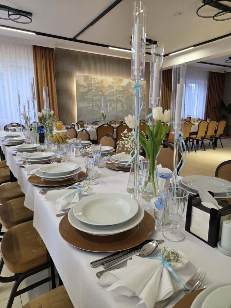 Specjalizujemy się w kompleksowej organizacji przyjęć – od kameralnych urodzin, przez chrzciny i komunie, aż po eleganckie wesela oraz jubileusze. Każde wydarzenie przygotowujemy indywidualnie, dbając o detale, atmosferę i najwyższą jakość serwowanych dań.